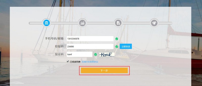 3、填写手机/邮箱号码,根据提示获取验证码,点击下一步