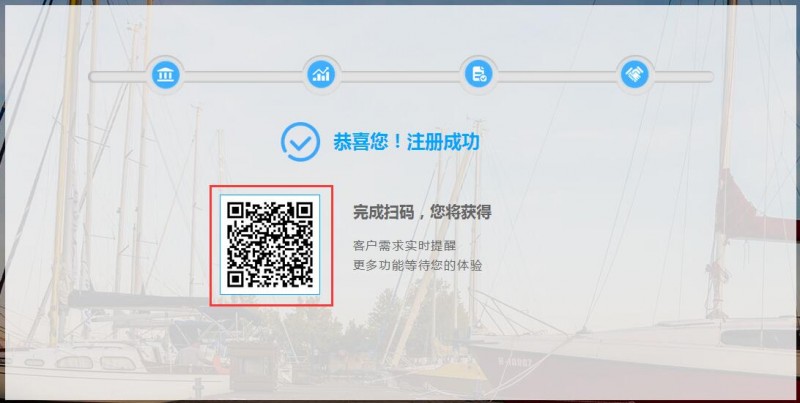 6、恭喜您,完成注册,最后一步微信扫码,绑定您公司运营人员的微信,就可以实时接收关于您企业的最新动态,更多功能我们在不断挖掘中