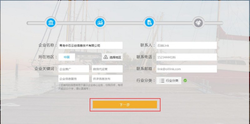 5、按照提示填写您的公司信息,填写完整后点击下一步(不完整是不能点的噢!)