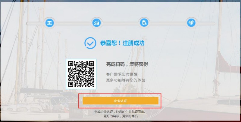 7、扫码完成后,您可以继续进行企业认证操作,完成企业认证,您的企业将优先展示,您发布的产品也将更具有权威性。