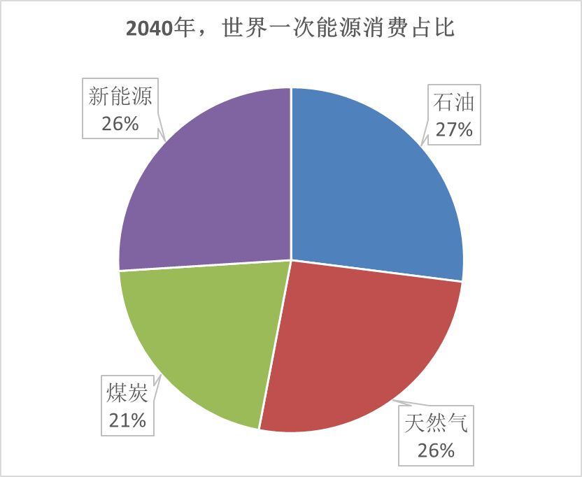 而到2040年,世界能源消费结构将呈现出前所未有的多样化。石油、天然气、煤炭、新能源在一次能源消费中的占比几乎旗鼓相当,分别占27%、26%、21%、26%。这意味着,能源行业将出现激烈竞争而非一家独大的局面。
