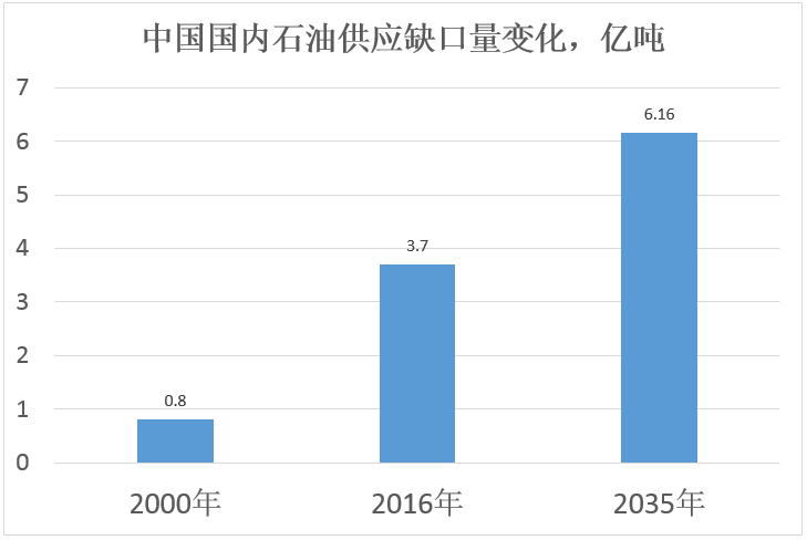 这意味着,中国国内石油的供给缺口将会越来越大,并于2035年达到创纪录的6.1亿吨。而这一缺口量,是2016年的1.7倍,是2000年的7.6倍。