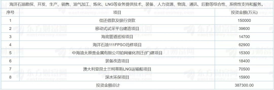 据了解,海油发展本次IPO计划募集资金37.33亿元,其中15亿元用来偿还借款及银行贷款,其余将投向试采平台建造项目、澳大利亚昆士兰柯蒂斯LNG运输船项目、海底管道巡检项目等七大项目。