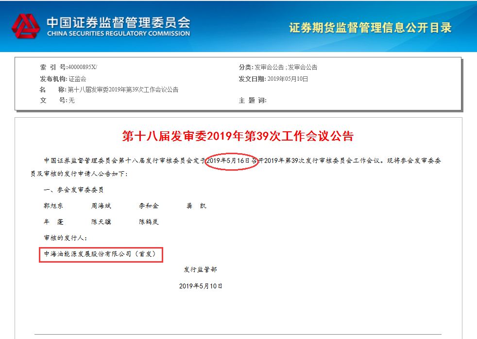 5月10日,中国证监会发布公告,中海油能源发展股份有限公司(以下简称“海油发展”)将于2019年5月16日接受IPO上会审核。