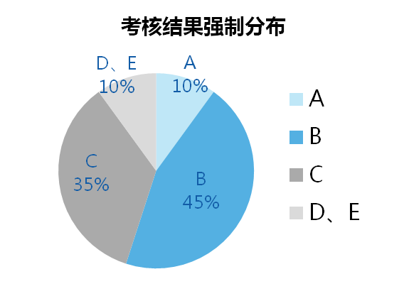 对于专业技术人员,长庆油田实行两种考核——年度绩效考核及任期综合考核,将考核结果分为ABCDE五个档位,并明确每一档位的比例(比例如下图)。考核的结果与岗位、薪资直接挂钩,是技术人员岗位晋升、薪资兑现的重要依据。考核制度的实施使得岗位、薪资灵活变动得到了实现。